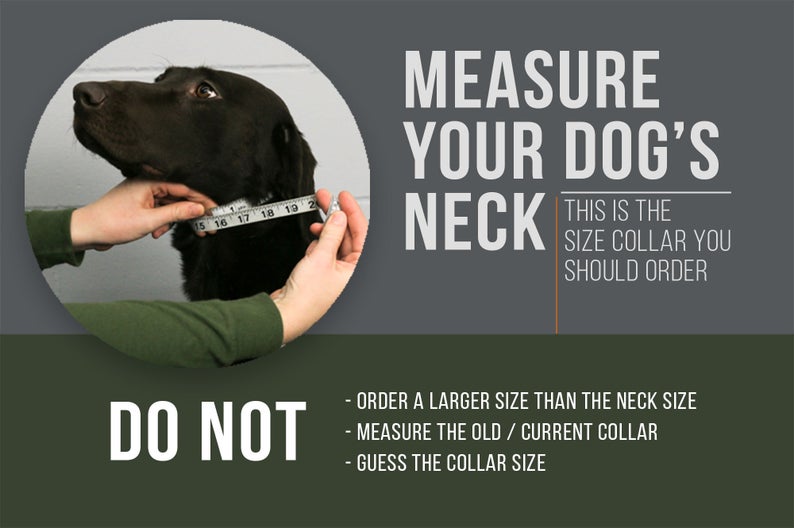 Measure your dog’s neck at the highest point just below the ears. This is where the collar should be worn and the size to order. Do Not add or subtract any inches from this measurement. Round down if your measurement is a fraction (example: if you measure 15.5 inches, order a 15-inch collar.