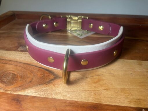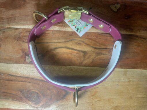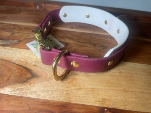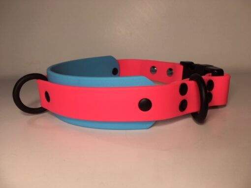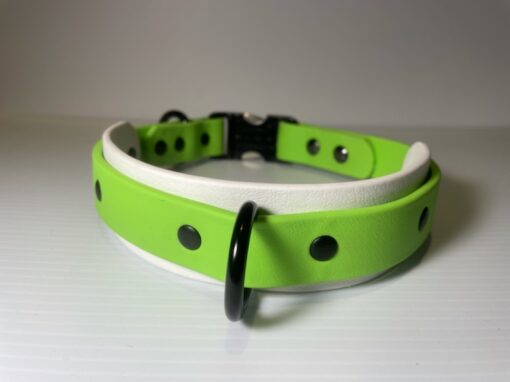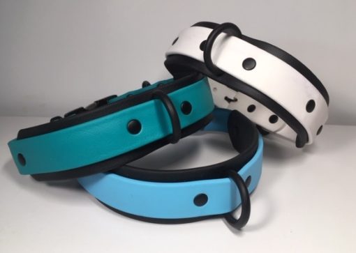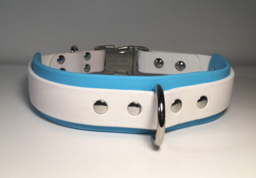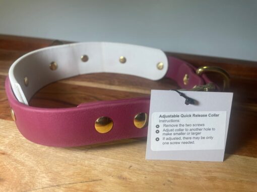 Our collar Buckles are made of Aluminum and coated with either Satin Silver, High Polished Nickle Plated Silver, Brass Plated or Powder Coated Black. These collars are adjustable by 1 inch.. Example: our 18″ can be adjusted up or down by 1/2 inch (17.5, 18, or 18.5). Measure your dogs neck and add one inch and/or provide the length you want the collar based on a current collar you have that you like the fit. The collar does allow for 1/2″ bigger and 1/2″ smaller. To adjust the collars length, remove the silver screws and align with one of the other holes to increase or decrease the size. If this adjustment is needed, you may only need one screw vs the 2 that came with the collar.