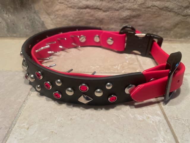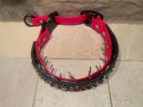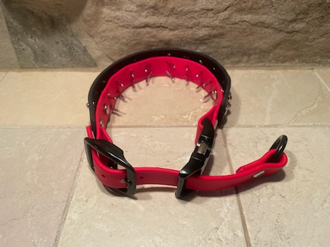 This collar is made of 2 Layers of Beta Biothane. The inner layer has the prongs inserted directly into the Biothane.