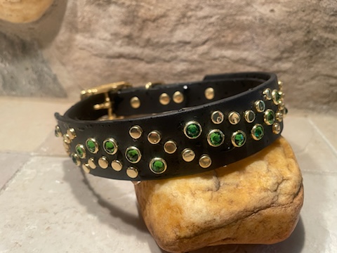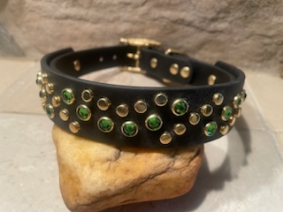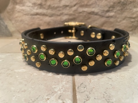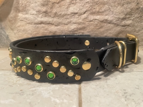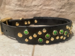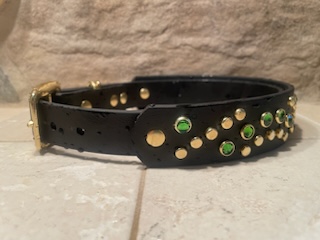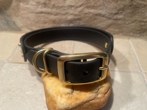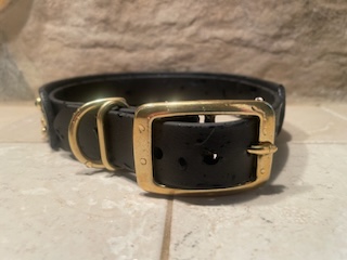 This collar has solid Brass hardware and a center bar buckle closure which is adjustable up or down within 1.5 inches.